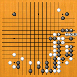 (5図) 黒1、3に白4とマガったのが実戦です。これには黒5、7と外側をオサえます。白8とサガってくれば、黒9と切ってこれは攻め合い黒勝ちになります。 |