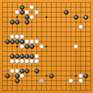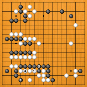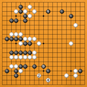 (3図) 2図黒15で、本図の黒1とコスんで下辺から眼を取りにいっても、白2のアテから白4とツガれるくらいで白は生きています。 |