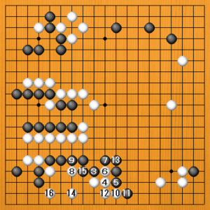 (2図) 1図の黒3で、本図黒3のコスミツケから黒5とオサエ込むのも、白6の出から白8のノゾキでスペースを広げられます。続いて白10、12のハネツギには黒13と守るくらいですから、白14と打たれて生き形です。黒15とグズんでも白16と広げられると白のスペースは広く、黒はこの白の眼を取ることができません。 |