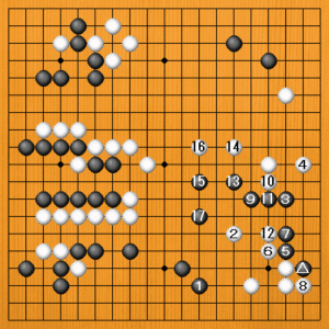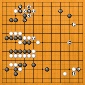 (手順図) 白△のノビで左辺の攻防が一段落したところです。黒1と下辺に展開し、白は2のツケから4と切り違えて上辺を仕掛けてきました。黒は色々な応手が考えられますが、黒5のノビから、黒3の石を捨てて黒7、9と左上隅を確定地にする変化を選びました。白は10、12と右辺の大場に回り、黒13のツケに白14とノビたところが今回のテーマ図です。 |
