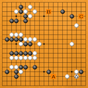 白△とノビてきたところです。小林光一名誉棋聖は候補手A・B・Cからどの手を選んだでしょうか? |