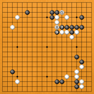 (9図) 実戦は7図に続いて白6とオサえてきました。しかし、黒7、9の出切りが厳しく、やはり黒成功です。白を厳しく分断することで、黒は優位に立つことができました。 |