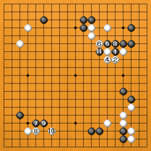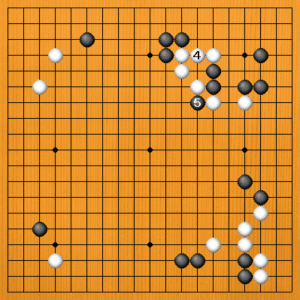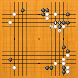 (7図) 実戦の進行は黒1に白2とノビました。黒3、5のワリツギが手厚い手です。 |