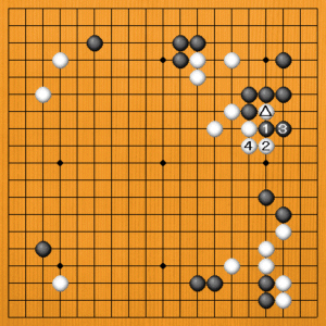 (4図) 3図黒7で黒1と切っても、白2、4と白△を捨てれて大したことはありません。2図黒1のワリコミは、白の薄みを狙うのはいいのですが、手段がよくありませんでした。 |