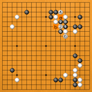 (5図・正解図) 黒1(A)のツケが正解です。白2には黒3とブツカって、白の形が窮屈です。白4のオサエがピッタリに見えますが、黒5と切り、白6のノビに黒7が強烈です。次に黒aとbが見合いになっており、白をバラバラにすることができます。 |