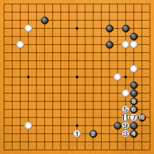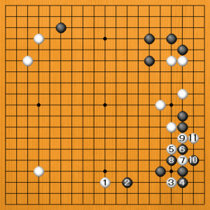 (9図) 白7のときに黒8と切ってきたら、白9、11と突き破ります。右辺の薄みを自然に補うことができ、本図もやはり白がうまくいっています。 |