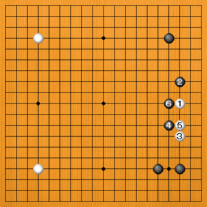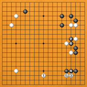 (1図) 手順の白6では、以前は白1のワリうちがよく打たれていたのですが、今では黒2のほうからツメられ、白3に黒4、6と圧迫されて白がよくないとされています。 |