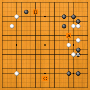 黒△と受けたところです。この局面で、A・B・Cのどの手を選びますか? |