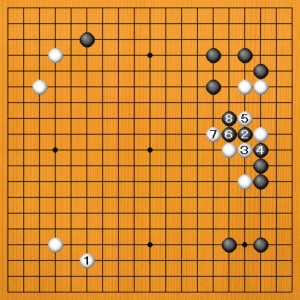 (3図) 右辺の白を補強せずに、白1などと他の大場に打つと黒2のツケコシが厳しい手です。白3、5とカカえても、シチョウは黒有利なので黒6、8と逃げられてしまい、白はバラバラです。 |