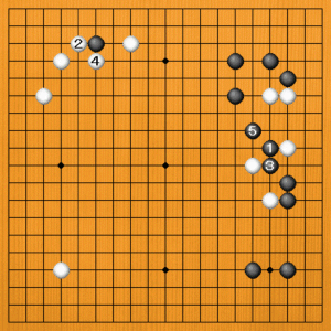 (5図) 白1(B)の手は60点です。ただ、黒2、4と左上を逃げてくれれば、白3、5と上辺を荒らして、白にとって理想的な展開になります。 |