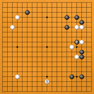 (2図・正解図) 白1(A)が100点の手で正解です。ここを守るのが大事なところで、白1と打つことによって白全体が安定します。 |