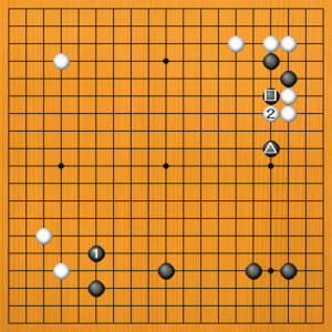 (8図) 右上を手抜きして黒1などとトブのは白2と連打されて、黒▲と■の間を分断されてしまうと、右上の黒を逆に攻められてしまいそうです。黒▲と■の連絡を保つのがとても大切です。 |