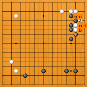 (9図) 黒1とオサえれば白2とワタるくらいです。そこで黒3としっかりオサえておきます。後に黒aの切りから白b、黒c、白d、黒eと白を分断するような手も残っていますから、黒3は非常に手厚い一手です。また、黒3により右下から下辺の黒模様もいい形になります。 |