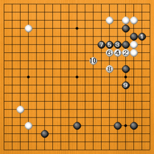 (10図) 黒1(B)のサガリは60点です。厳しい手ではあるのですが、白2のマガリから白4と出られてしまいます。黒5、7とノビて戦えないこともないのですが、白8、10となると下辺の黒模様が自然に消えてしまうのが不満です。 |
