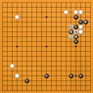 (11図) 黒1のサガリには白2とケイマしてくるような手もあります。黒3、5と出切ると白6で両アタリです。いずれにしても右辺を突破されてしまうと少し黒が薄くなってしまうので、黒1は60点です。 |