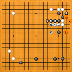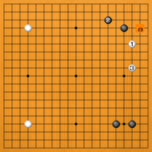 (2図) 白1に黒2と受けてきたら、白aのスベリや白3とヒラいて治まられます。白1のカカリは、第1・2回の形よりもよりゆとりを持って右辺を割ることを目指しています。 |