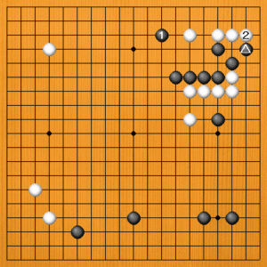(13図) 黒▲と隅の白に迫っても、黒1のツメには白2とオサえられて、逆に黒にキズができるような意味もあり、そこまで攻めることができません。 |