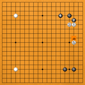 (1図) 白1のカカリは狙いのある打ち方です。ここで黒2のコスミツケから黒4と受けるのは、第1・2回のワリ打ちのときとは違い、白aではなく、白5と一路広くヒラかれてしまいます。 |
