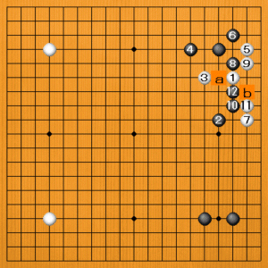 (4図) 白1から7までの定石は、黒8のコスミツケから黒10のコスミを狙うことができます。白11には黒12とブツかられて次に黒aとbが見合いです。本図は白がつらいので、白3から7の定石は最近では打たれなくなりました。 |