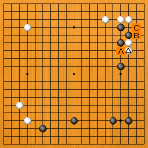 白△と動いてきたところです。この局面で、A・B・Cのどの手を選びますか? |