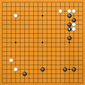 (手順図) 黒1から5と星と一間ジマリの構えに対して、今度は白6とカカってきたときの布石です。黒は7とハサみたいところで、白8の両ガカリは色々な打ち方のあるところです。白10の三々は比較的簡明な打ち方で、黒13から15と構えたときに白16と動き出してきた場面です。 |