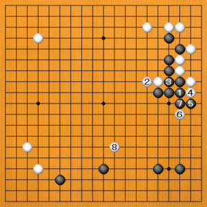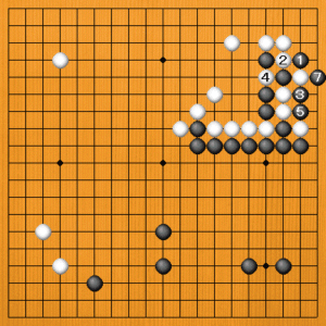 (7図) 右上の白地も大きいようですが、黒1のハネ出しから黒7というヨセの狙いが残っています。すぐに打つ手ではありませんが、白地は見た目ほど大きくありません。 |