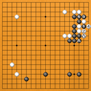 (9図) また、白△と黒△を利かされてしまうと、黒1から3、5の狙いを打ったときに、右辺の白がすでに生きているのも減点材料です。 |
