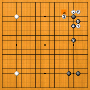 (2図) 白1、黒2のときに白3と高く両ガカリする手もあります。同じように白7までとなったときに、白3がいいか、白aがいいかは難しいところです。 |