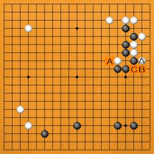 白△とハネたところです。この局面で、A・B・Cのどの手を選びますか? |