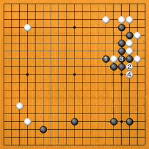(3図) 白5の三々入りに対して、黒は6とこちらからオサえるのもあります。白7には黒8、10のワリツギが簡明で、黒14までとなります。黒は上辺を大事にする進行です。 |