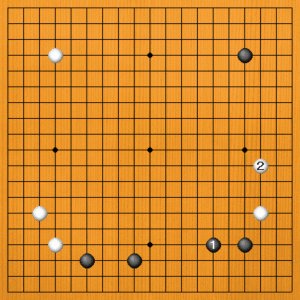 ニ連星同士の布石です。ここで、黒1も悪くはありませんが、これには、白2とヒラいてゆっくりした布石になります。
