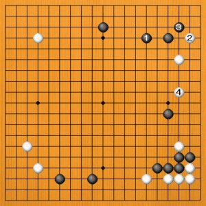 白は右上を手抜きして、白1といきなりオサエ込んでくるかもしれません。これに対して、つい黒2とサガってしまいそうですが、これはいけません。白3とトンで、黒が苦しくなりました。
