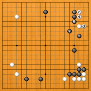 後に、黒1のハネから3とオサエ込む筋があります。白4と切るのは無理で、黒5と外からアテて黒7まで。白二子をツグわけにはいきません。