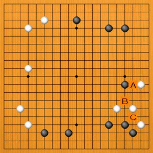 黒1(B)のノゾキもよく使われる手です。それから黒3とツケて右辺を先手で止めようというわけです。ただ、やはり右辺の形に隙が残っています。白が強くなっているのも気に入らない。
