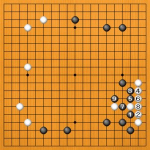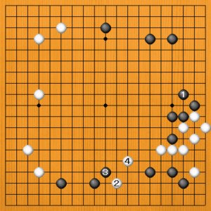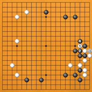 続いて、白1のノゾキから3とトンでこられると、どちらが攻めているか分からないようなことになります。これでは黒が不十分でした。