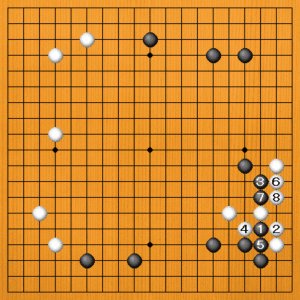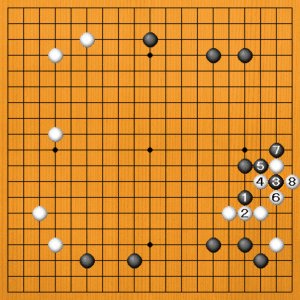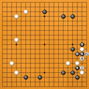 白の変化を見ておきましょう。黒3のコスミに対して、白4とコスめば、中央と分断されることはありません。しかし、黒5の出から7とハサミツけて、右辺がピッタリ止まります。