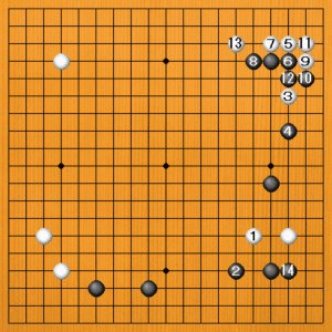 テーマ図までの状況を示しておきましょう。白1のトビは十分考えられる手です。ただ、白3とカカるのは無理で、黒4のハサミが厳しい。白5と三々に入って収まる間に、黒12まで厚くします。それから、黒14とサガって白二子を攻める態勢をとれば、黒が主導権を取ることになるでしょう。