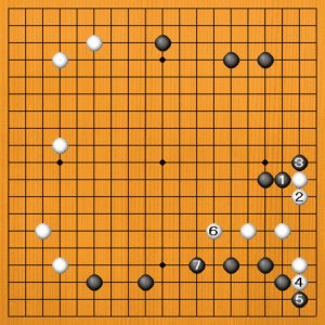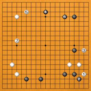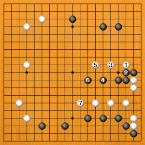 白は1とスベって3まで、ここで収まるくらいです。これで部分的には一段落ですから、黒4から白7まで大場に打ち合って落ちついた局面になりました。この図が今回のテーマ図です。