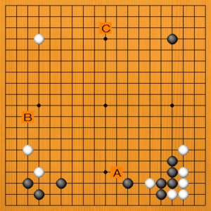 Aの肩ツキは黒模様を制限する手です。Bの二間ビラキはよく打たれる定型です。Cは上辺の大場です。