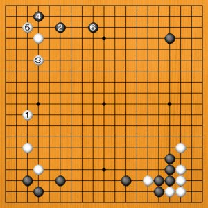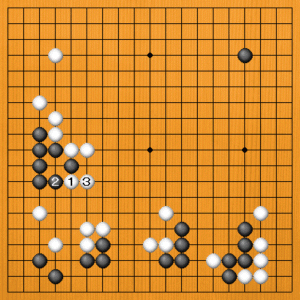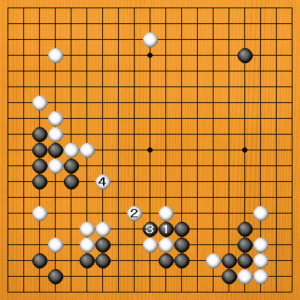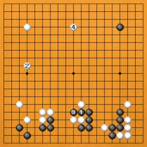 今から黒1、3と出てくるのは、白2のトビから4と止めて、ますます厚くなって白が十分です。