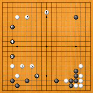 白1(C)は気になる大場ですが、左下の白が弱いので、黒2のハサミが厳しくなります。白3、5とトンで中に出て行きますが、これは実のない手です。こういう手を打たされるのがつらい。その間に黒は4、6と左辺を強化して、下辺も黒8と大きな地を作ることができるでしょう。これは白の失敗です。
