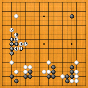 厚みは攻めに使ってこそ生きますから、白2と上からツメて、黒3と白の厚い方に追い込むのが正しい方向です。さらに黒を追撃して、白4の肩ツキから6とツケて攻めを継続します。黒11の切りには、白12とノビるのが落ち着いた好手です。