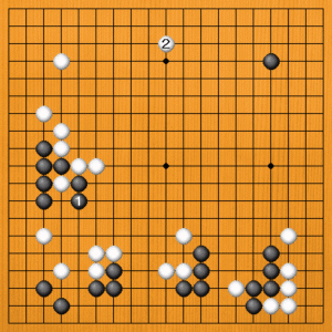 黒1の出は、相手をすることはありません。黒1、3の間に、白2、4と左辺から上辺に展開して雄大な模様を広げます。白のスケールに比べて、黒は下辺に偏っている感じがします。