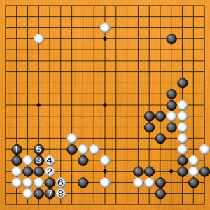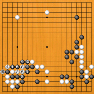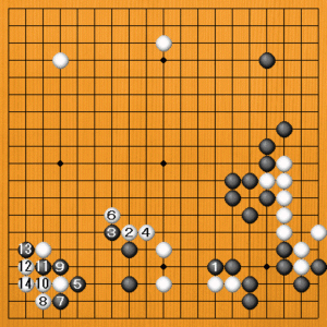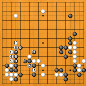 (手順図) 私が黒番の実戦です。右辺に強力な黒の厚みがあり、これを活かして下辺の白をどう攻めるかという局面です。黒1と押したときに、白は手を抜いて白2、4とツケ引いてきました。黒も直接は受けずに黒5とツケたのはモタレ攻めのようなテクニックです。白6と中央をハネてきたので、黒7から13までと左下隅に味をつけて、白が14とツイだところが今回のテーマ図です。 |
