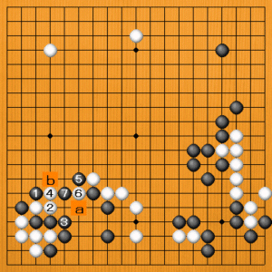 (7図) 黒1から5に対しては白6とノビるくらいですから、黒7とハネて白3子のダメを詰めます。白8の切りには黒9とツイで、白をダメヅマリにした効果で、後に黒aやbが利いて黒は非常に厚い形になるので、黒十分の進行となります。 |