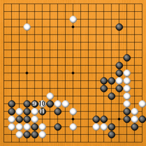 (2図) 続いて黒9のマゲに白10とアテてくれれば、黒11の両アタリがぴったりになります。これは白の失敗です。 |