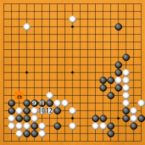(3図) しかし、黒9のマゲには白10と受けられてしまいます。黒11のツギに白12の切りとなりますが、下辺の黒がすべて取られては、白地が大きいので黒失敗です。左辺の黒も厚いようで、まだ白aのノゾキから攻められる味も残っています。 |