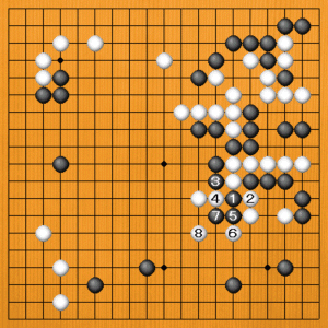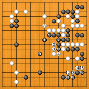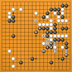 (8図) 黒1には白2と受けるくらいですから、これを利かしと見て黒3とケイマします。白4には黒5と守り、白6、黒7となったときに、黒1と白2の交換は大変な利かしになっているのが分かるでしょう。この交換が働き、白8の連絡には黒9のブツカリで白を切ることができます。中央に対して白12のノビは利きますが、それだけでは白14に黒15でワタることができますから右辺は大丈夫です。白10とすぐに動くことはできないので、本図は黒満足の進行です。 |