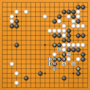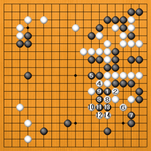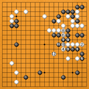 (手順図) 右辺で競り合いが起こっています。実戦は黒1と動き出し、白2に黒3から5とワタって白の根拠を奪いました。白は6、8のワリツギで右上の白を補強しつつ、黒9のツギに調子で白10と出てきました。黒11に白12とケイマしたところがテーマ図です。 |