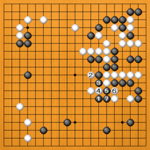 (3図) 白2とツケられたら、黒は5と守らなければなりません。白6のアタリを決められ、白8でまず右上の一団を安心されてしまいます。黒9と右辺を攻めることになりますが、黒も薄いので、白10くらいから簡単に治まられてしまいます。仮に黒11、13などと受けていると、白14、16で逆に右辺の黒を取られてしまいます。 |